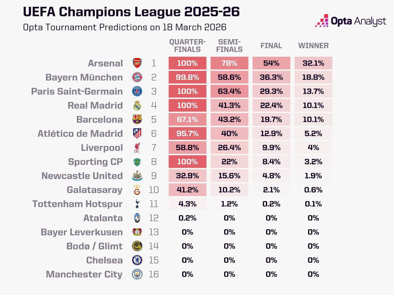 Opta versiyasiga ko‘ra, jamoalarning Chempionlar ligasi g‘olibligi uchun imkoniyatlari: