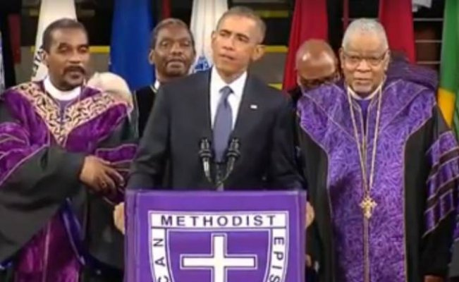 Obama Charlston cherkovida otib tashlangan pastorning dafn marosimida ma'yus kuy ijro etdi