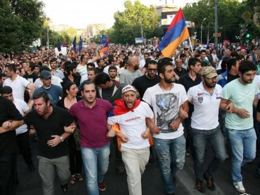 Yerevanda namoyishchilardan biri o‘z og‘zini tikib qo‘ydi