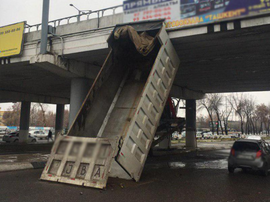 Chilonzorda yuk mashinasi tushirilmagan bort kuzovi bilan ko‘prikka urildi