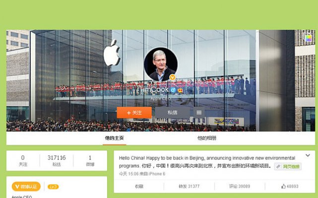 Tim Kuk Xitoyning Weibo ijtimoiy tarmog‘ida akkaunt ochdi