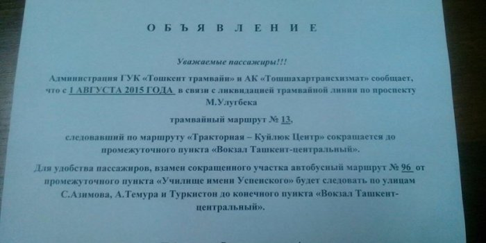 Toshkentda 13-tramvay yo‘nalishi qisqartirilishi mumkinligi aytilmoqda