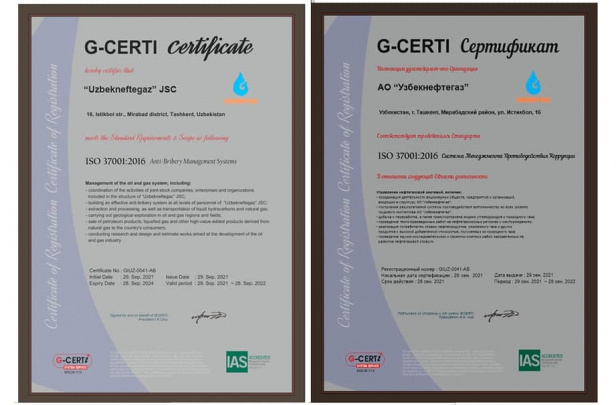 “O‘zbekneftgaz” AJning Korrupsiyaga qarshi kurashish tizimi xalqaro muvofiqlik sertifikatiga ega bo‘ldi