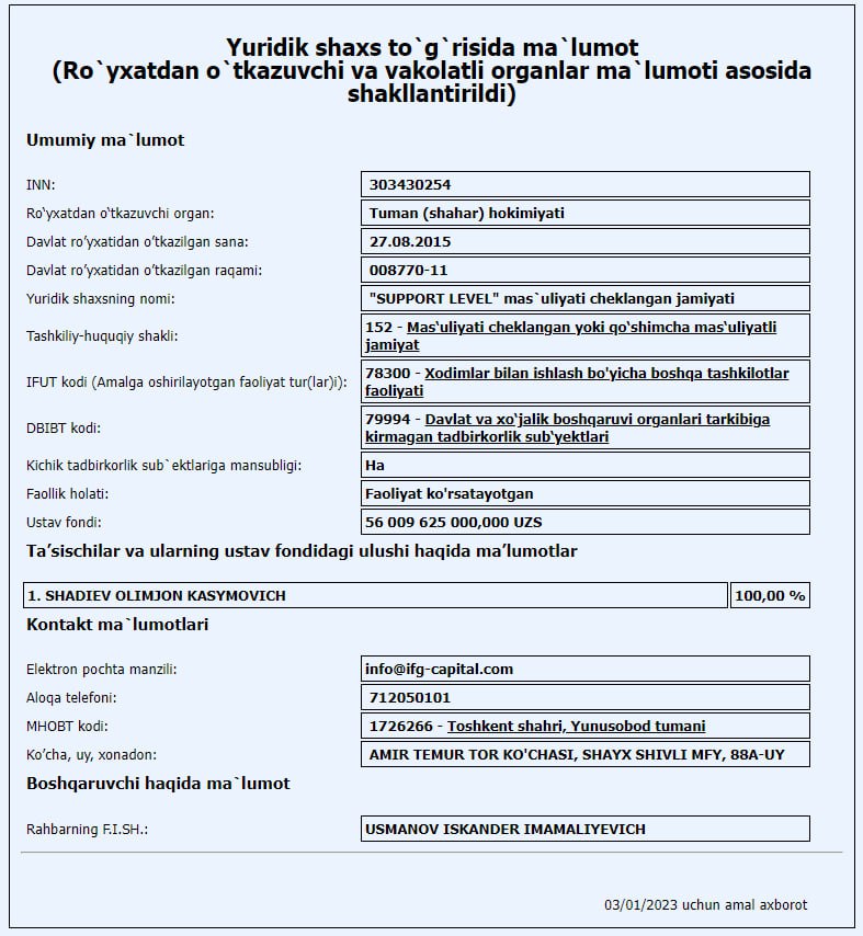 ООО Support Level было создано в августе 2015 года, имеет уставный капитал в размере 56 млрд сумов и единственного учредителя в лице Олимжона Шадиева.