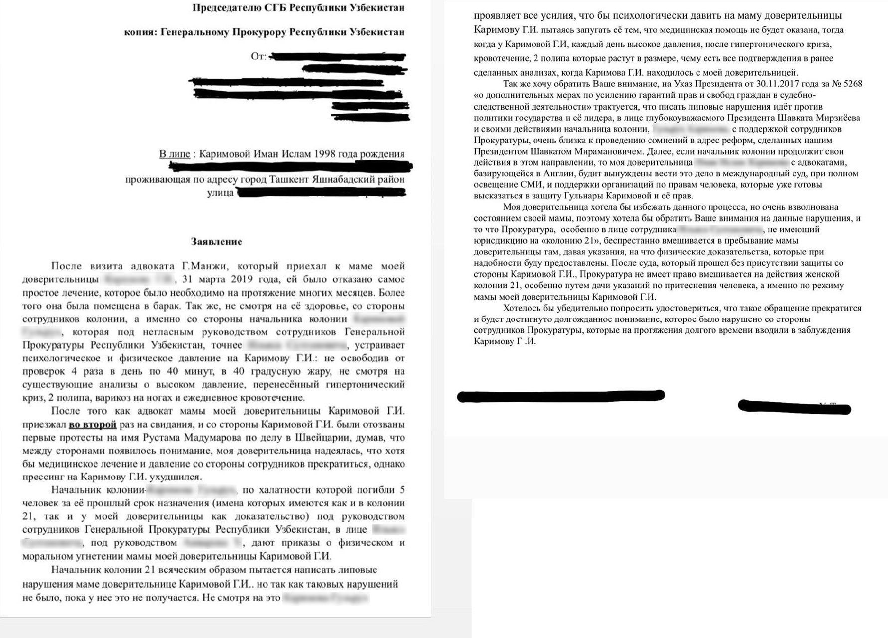 Сегодня, 15 июня, дочь Гульнары Каримовой и внучка первого президента Узбекистана Иман Каримова опубликовала на своей Instagram странице письмо, которое было адресовано председателю СГБ и генеральному прокурору Узбекистана.