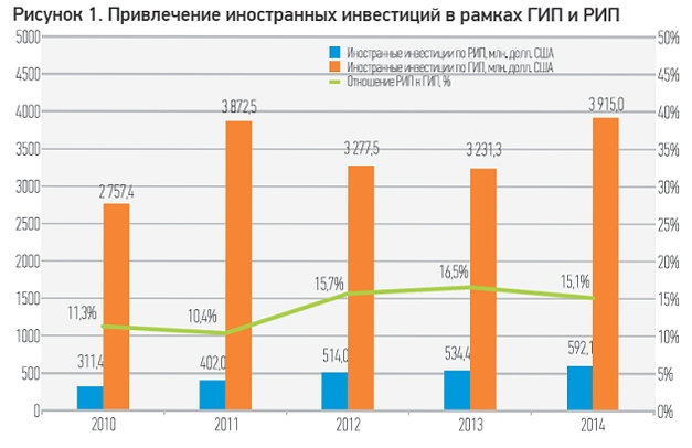 Чтобы сохранить высокие темпы экономического роста, не обойтись без существенного увеличения объемов инвестиций в экономику страны, в том числе иностранных. В последние годы их доля и кредиты в общем объеме инвестиций в основной капитал варьируются в пределах 20–30%. Анализ показателей по привлечению инвестиционных потоков в разрезе двух программ — Государственной инвестиционной программы, действующей в масштабе всей страны (ГИП), и региональных инвестиционных программ, осуществляемых в каждом регионе (РИП), — позволяет выделить ряд тенденций и особенностей.