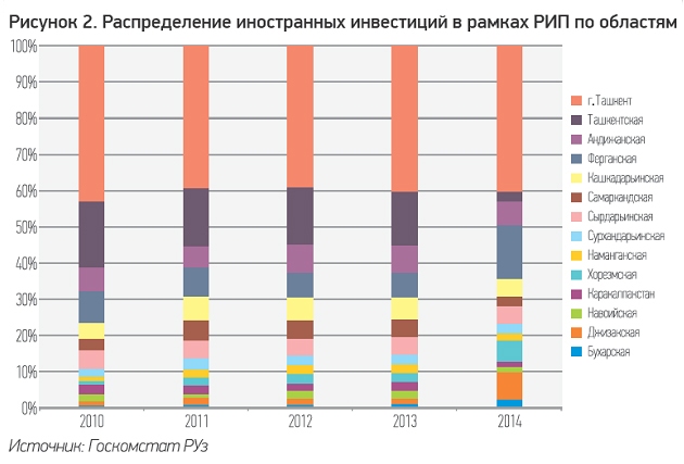 Существует выраженная диспропорция распределения иностранных инвестиций между областями. Более половины иностранных инвестиций сконцентрированы в г. Ташкенте и Ташкентской области. Удельный вес областей в распределении инвестиций с участием иностранного капитала варьируется от 1 до 8% (рисунок 2). Центр страны лидирует и по количеству вновь созданных совместных и иностранных предприятий в рамках РИП. Подобный дисбаланс отражает желание инвесторов быть ближе к функционирующей производственной инфраструктуре, высокому уровню логистических возможностей, наличию природных ресурсов, услугам рыночной инфраструктуры и кадровому потенциалу. Сложившаяся ситуация требует принятия комплекса мер по улучшению работы производственной, дорожно-транспортной, коммуникационной и рыночной инфраструктуры, а также по повышению качества подготовки и переподготовки кадров по востребованным на рынке труда специальностям в остальных регионах республики. Реализация крупных инвестиционных проектов позволяет создать свою собственную микросистему инфраструктуры (строительство локальных дорог, линий электропередач, жилых городков и осуществление работ по благоустройству), но малые региональные проекты этого себе позволить не могут. В условиях высоких затрат, требуемых для осуществления проектов развития инфраструктуры, все более актуальным становится подход к созданию индустриальных кластеров (на примере машиностроительного кластера в Андижанской области), специальных индустриальных зон (на примере СИЭЗ «Навои», СИЗ «Ангрен» и СИЗ «Джизак») и малых промышленных зон.