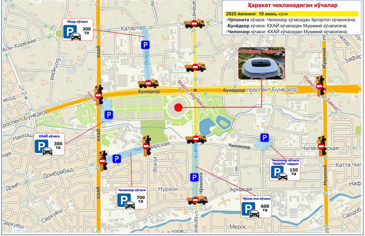 10 июня с 16:00 и до полного окончания мероприятия движение автотранспорта будет полностью запрещено на ряде улиц Чиланзарского района Ташкента.