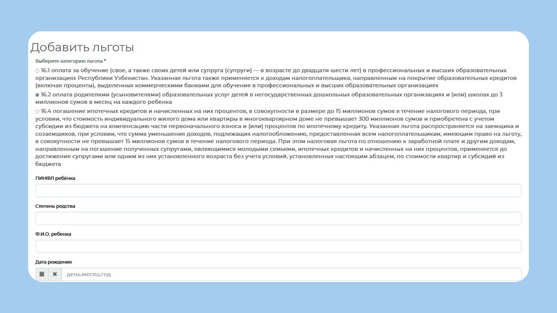 - Льгота позволяет получить до 3 млн сум за обучение ребенка.