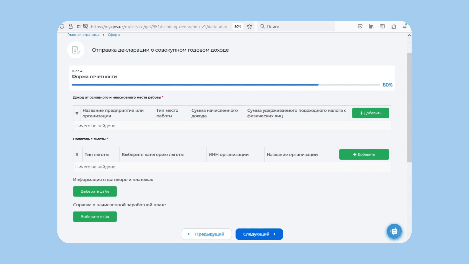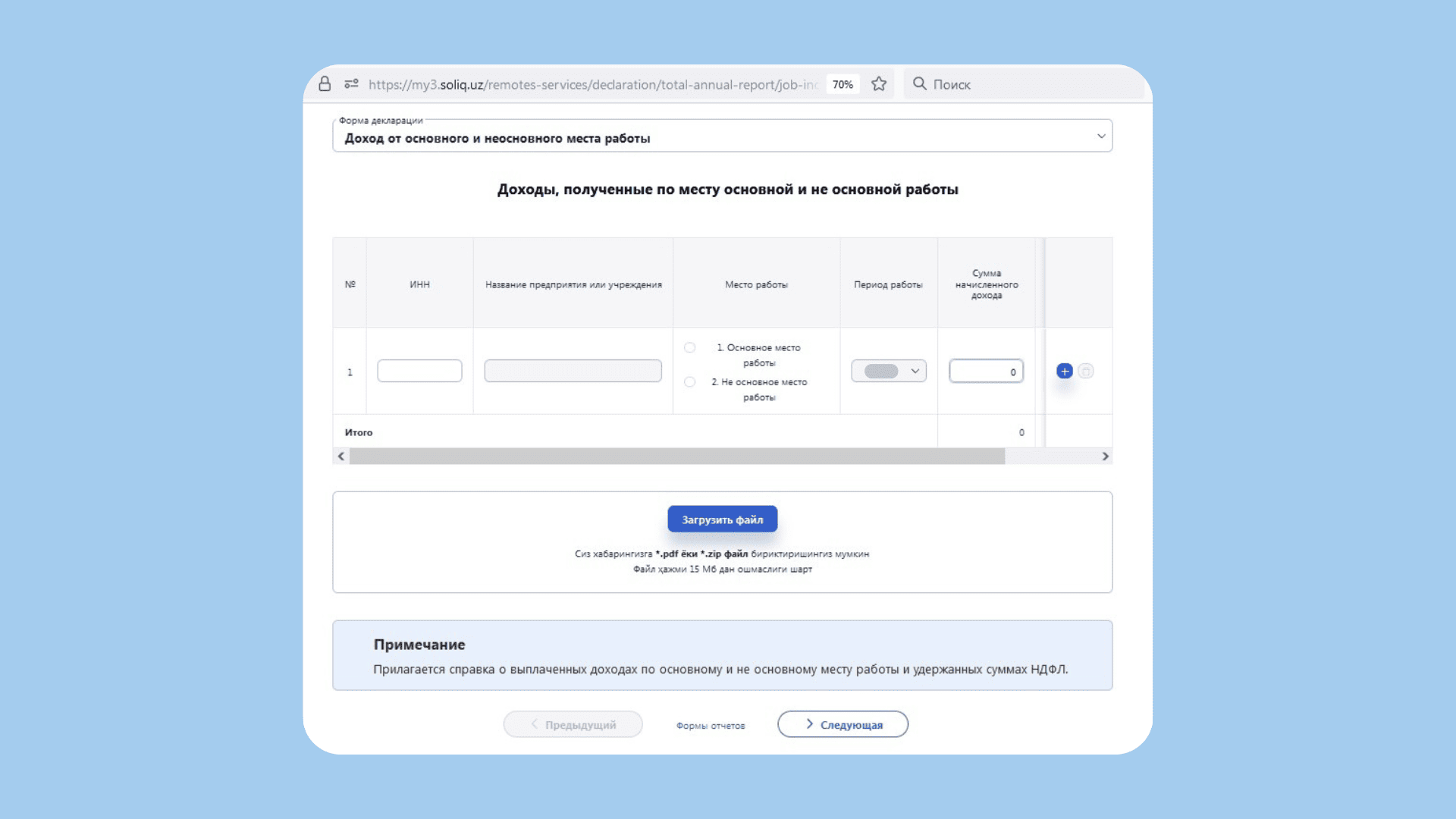 В графе Форма декларации выберите Доход от основного и неосновного места работы. Если ваших данных нет, вручную добавьте справки о заработке и уплаченном подоходном налоге, укажите ИНН с места работы, название, годовой доход и уплаченный подоходный налог.