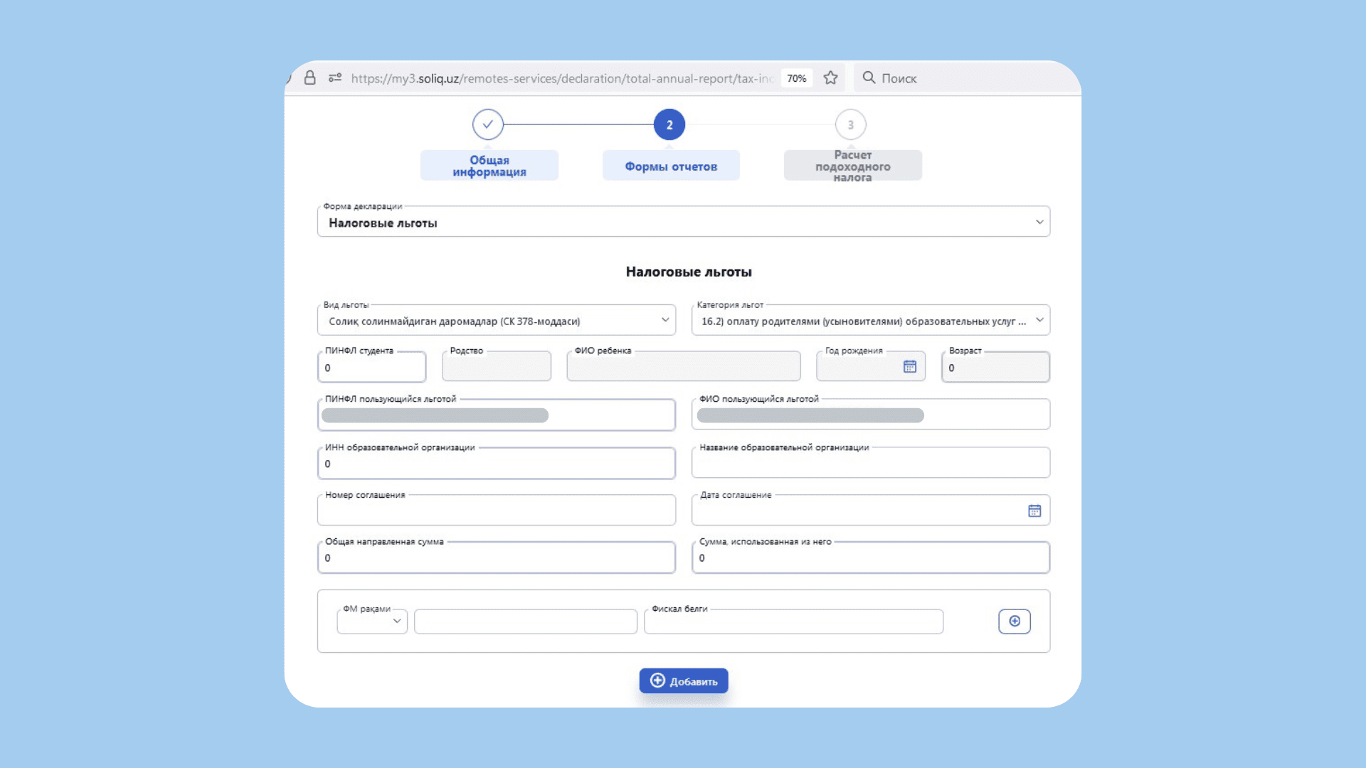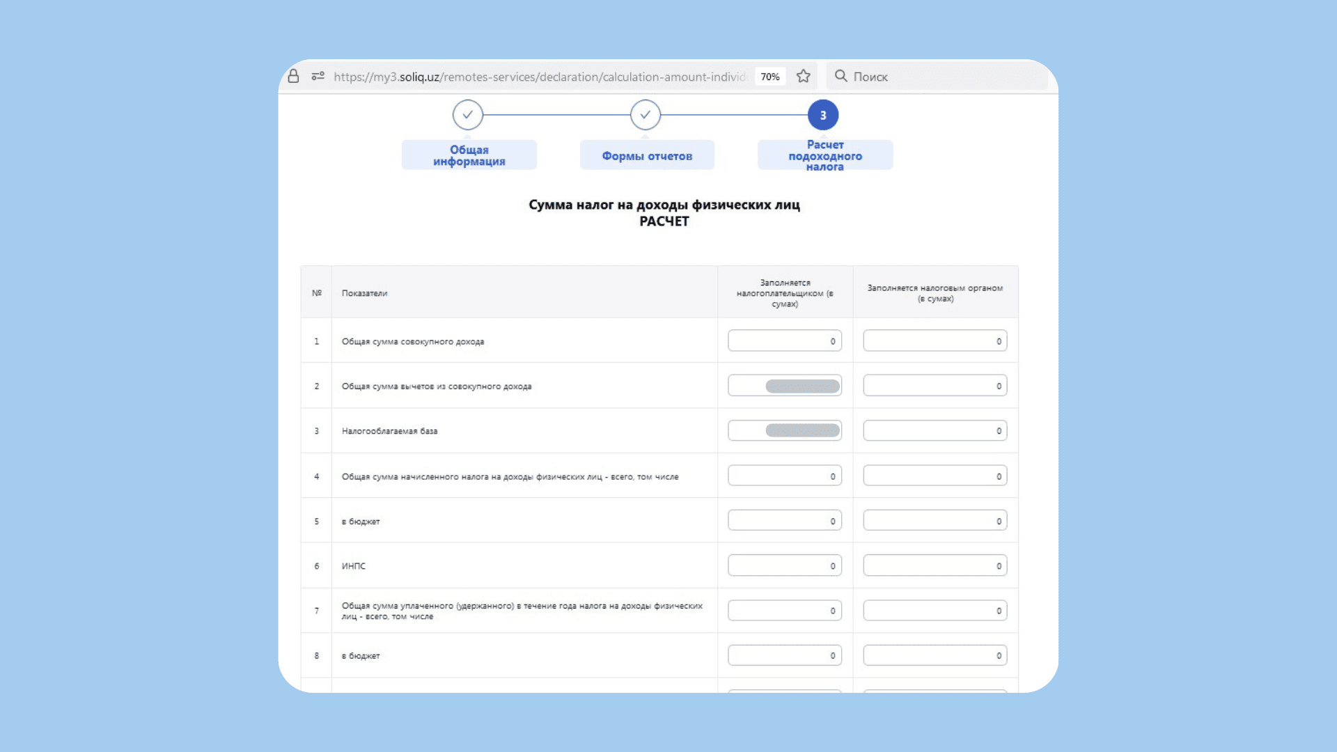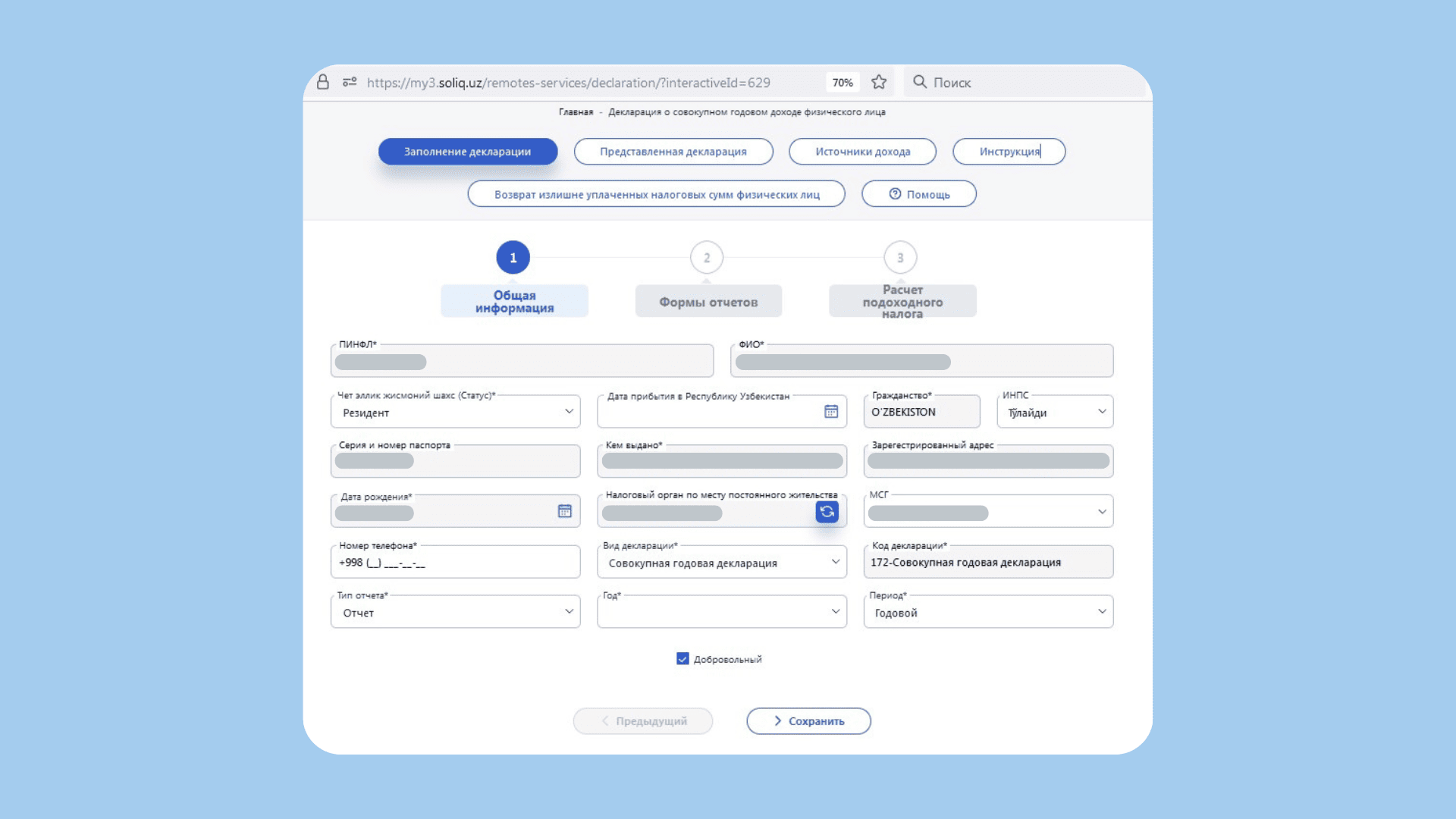 Третий шаг. Укажите свою махаллю, делаете ли взносы в пенсию, год отчета, ваш номер телефона и добровольность отчета. Тип декларации: Декларация о совокупном годовом доходе физических лиц. Тип отчета: расчет.
