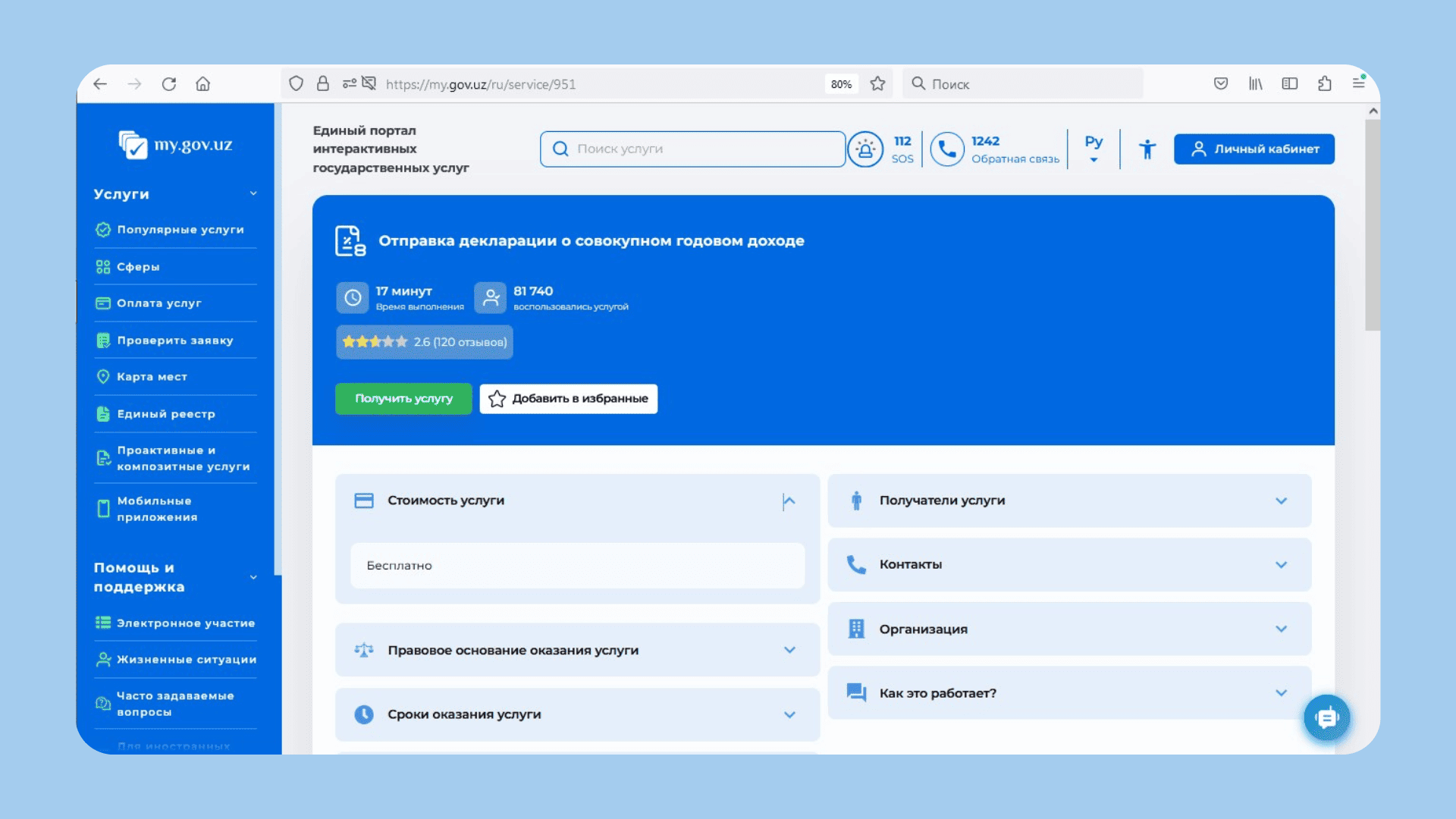 Найдите услугу «Отправка декларации о совокупном годовом доходе».
