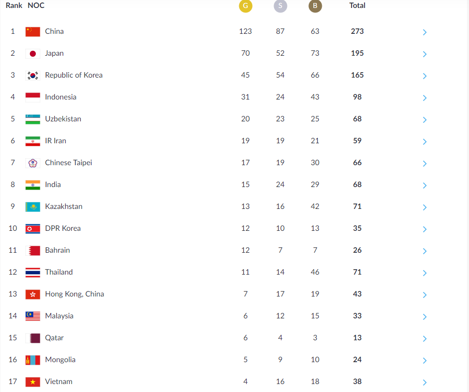 По итогам Азиатских игр узбекские боксеры завоевали пять золотых и две серебряные медали. В медальном зачете сборная Узбекистана поднялась на пятое место, сместив Иран. В копилке команды теперь 20 золотых, 23 серебряных и 25 бронзовых медалей.