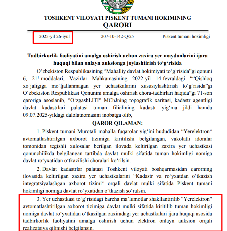 Участок был выставлен на продажу решением хокима Пскентского района Музаффара Арипова от 26 июля 2025 года.