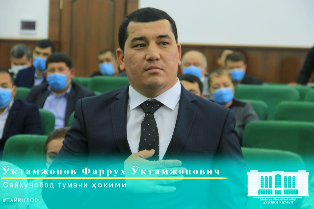 Новым хокимом Сайхунабадского района стал Фаррух Уктамжанов. До назначения он работал заместителем начальника УВД Сырдарьинской области.