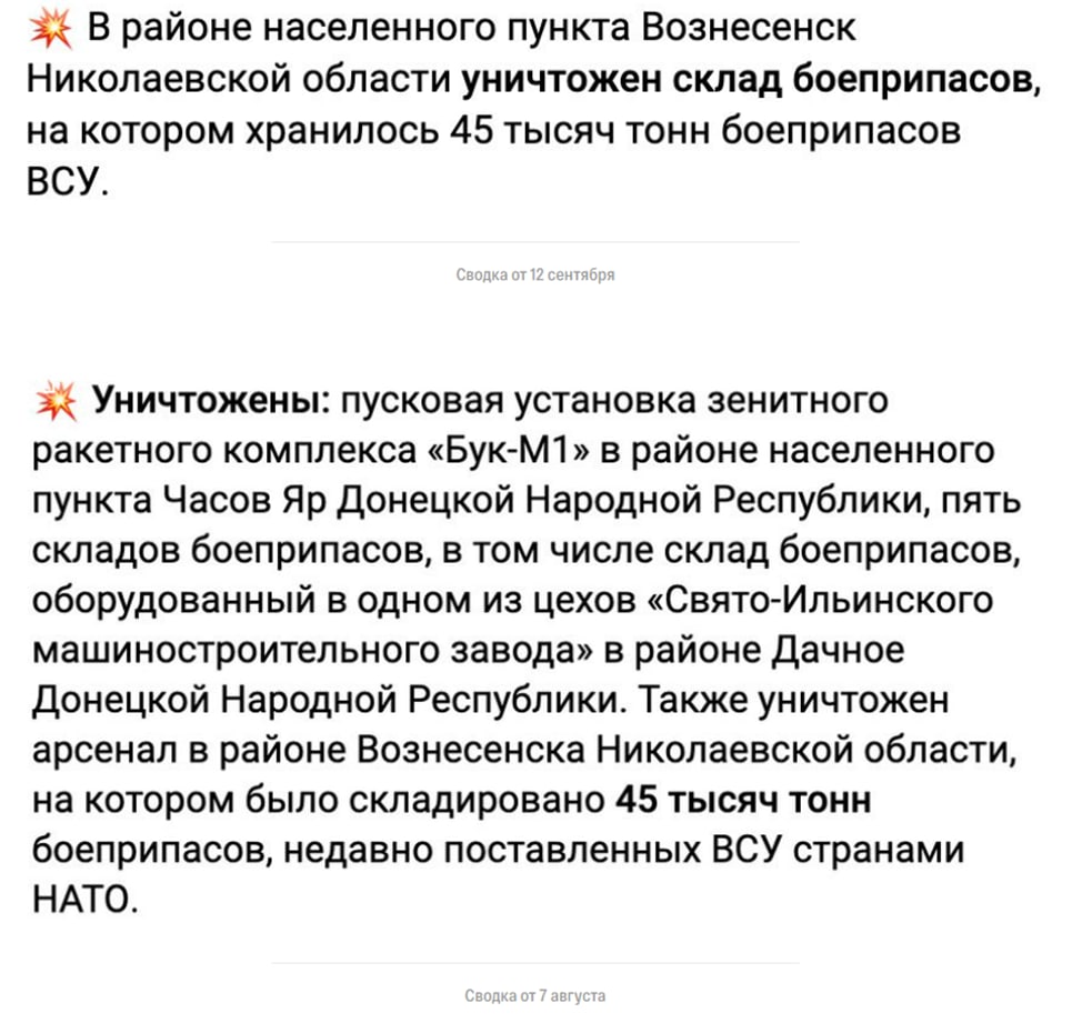 Минобороны России второй раз за месяц отчиталось об уничтожении 45 тысяч тонн боеприпасов в районе Вознесенска Николаевской области. Кроме того, о взятии поселка Пески отчитывались уже 4 раза, сбили 84 из 36 имевшихся у Украины беспилотников Bayraktar. В целом уничтожили больше техники, чем всего имеется у Украины с учетом западных поставок.