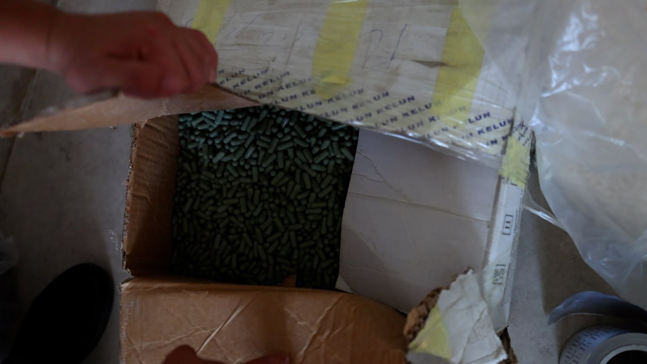 В ходе проверки были изъяты 11 станков для производства лекарств, 21 форма для таблеток, 389 килограммов порошков и таблеток, пневматическое оружие марки Вaikal и другие предметы.
