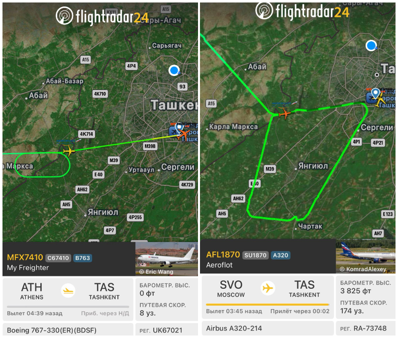 Аналогичная ситуация произошла и с самолётом грузового оператора MyFreighter, выполнявшим рейс из Афин. После непродолжительного ожидания в зоне ожидания борт благополучно приземлился в Ташкенте. Это означает, что самолёт некоторое время кружил по заранее определённому маршруту, ожидая разрешения на посадку.
