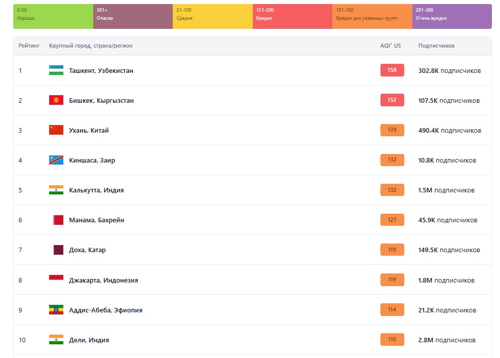 В рейтинге на втором месте находится город Бишкек (Кыргызстан) с концентрацией частиц PM2,5 на уровне 152 мкг/м³, на третьем — столица Конго Киншаса (132 мкг/м³). В первую десятку также вошли города Калькутта (Индия), Манама (Бахрейн), Доха (Катар), Джакарта (Индонезия), Аддис-Абеба (Эфиопия), Дели (Индия) и Багдад (Ирак).