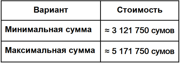 - в Ташкенте — от 1,8 до 3,2 млн сумов;
