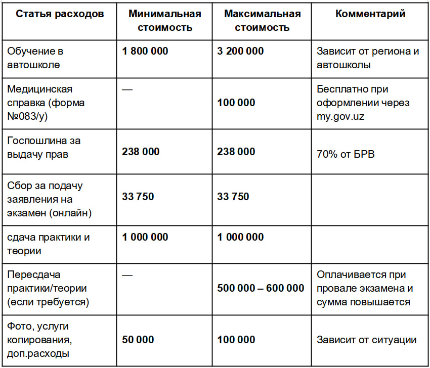 - Стоимость получения прав в среднем составляет 3–5 млн сумов, включая обучение, медсправку и госпошлину.