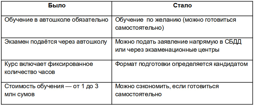 С 1 февраля 2026 года вступят в силу новые правила обучения водителей. Таблица ниже показывает, что изменится по сравнению с нынешней системой.Подробнее здесь-lex.uz