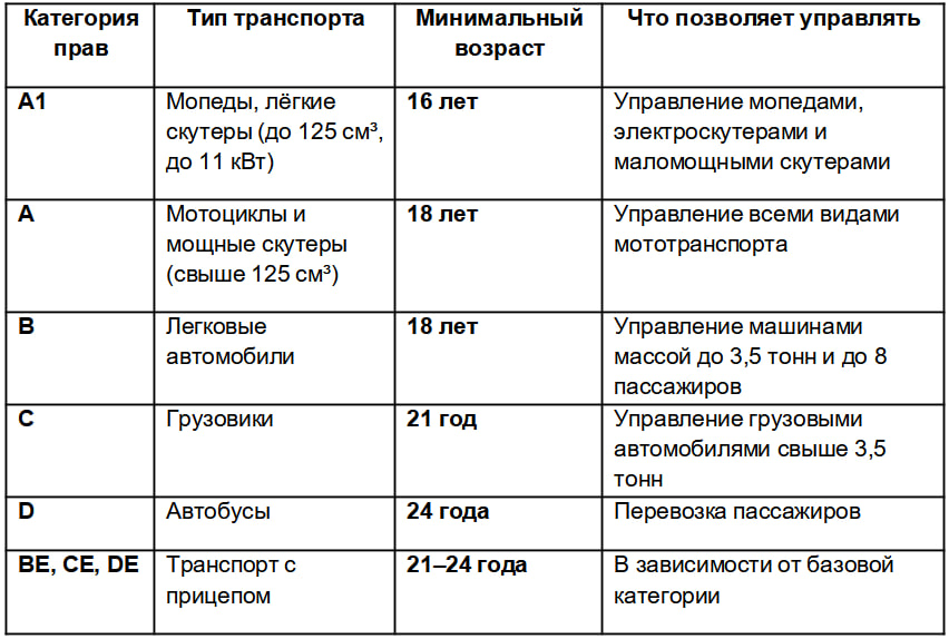 Возраст, с которого можно проходить обучение и сдавать экзамены на водительские права, зависит от категории транспортного средства.