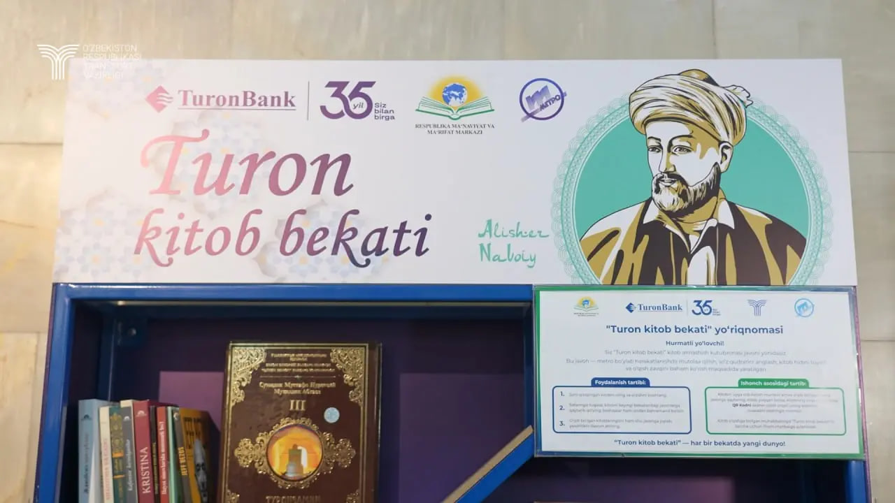 В рамках проекта под названием «Турон китоб бекати» на станциях метро установлены книжные полки с произведениями местных и зарубежных авторов.