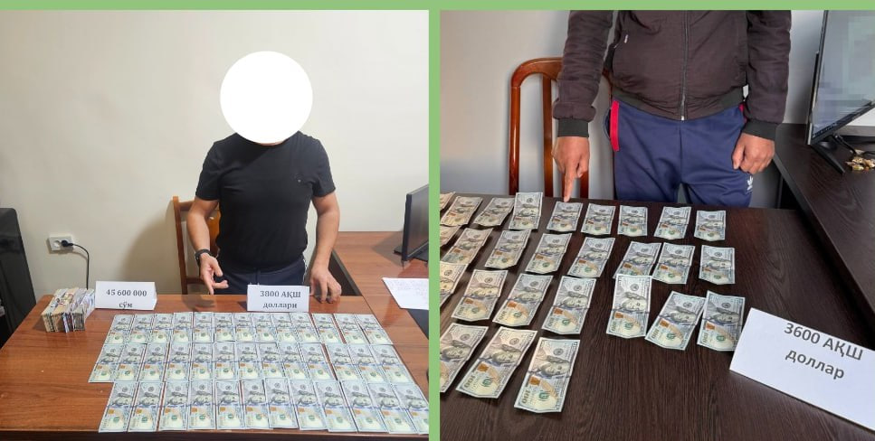 - в Гиждуванском районе Ш.И. задержан при покупке у Р.Н. 3 800 долларов за 45,6 млн сумов;