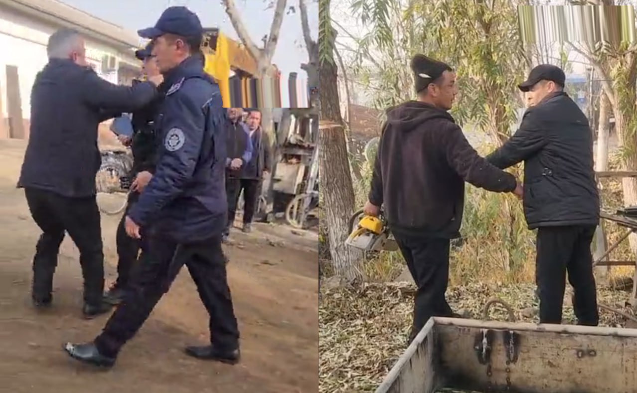 Эколог попытался остановить незаконную вырубку деревьев, но замхокима, при сотрудниках органов внутренних дел и местных жителях, силой оттащил его в сторону.
