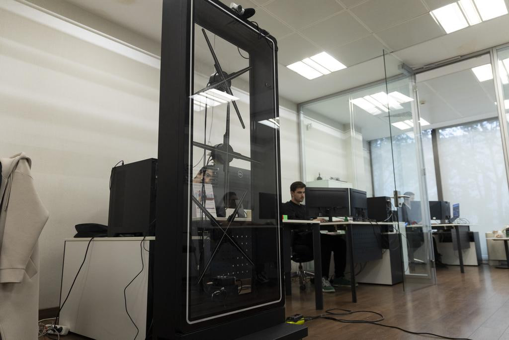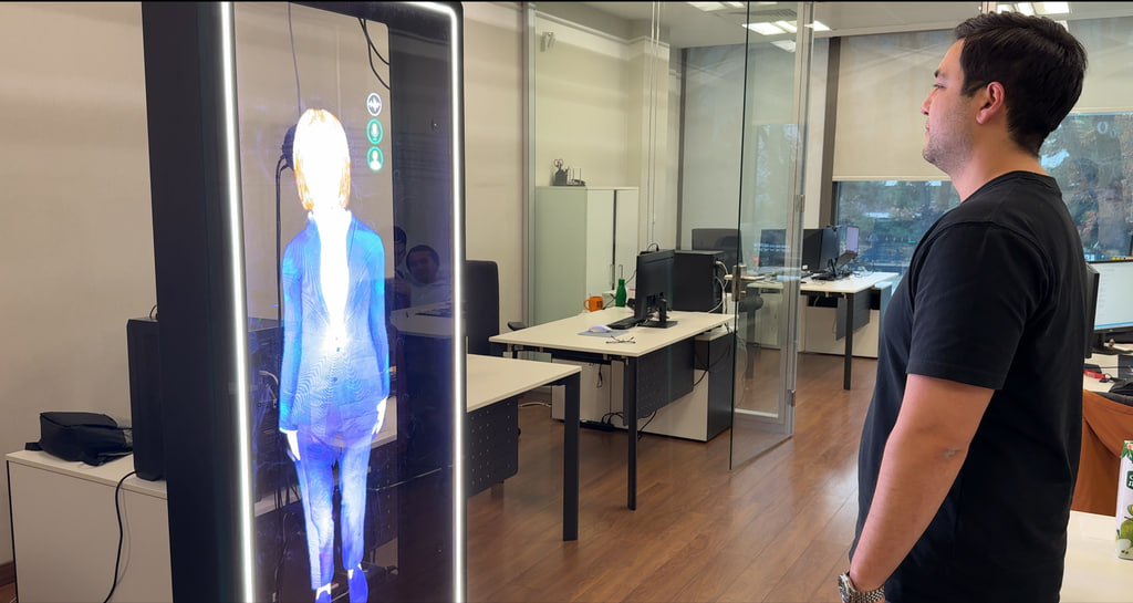 Голографический ассистент в отделении. Наш AI-аватар — это голографический виртуальный сотрудник, который встречает вас в отделении. Он «видит» клиента благодаря моделям компьютерного зрения, «слышит» и понимает речь, а говорит естественным голосом.