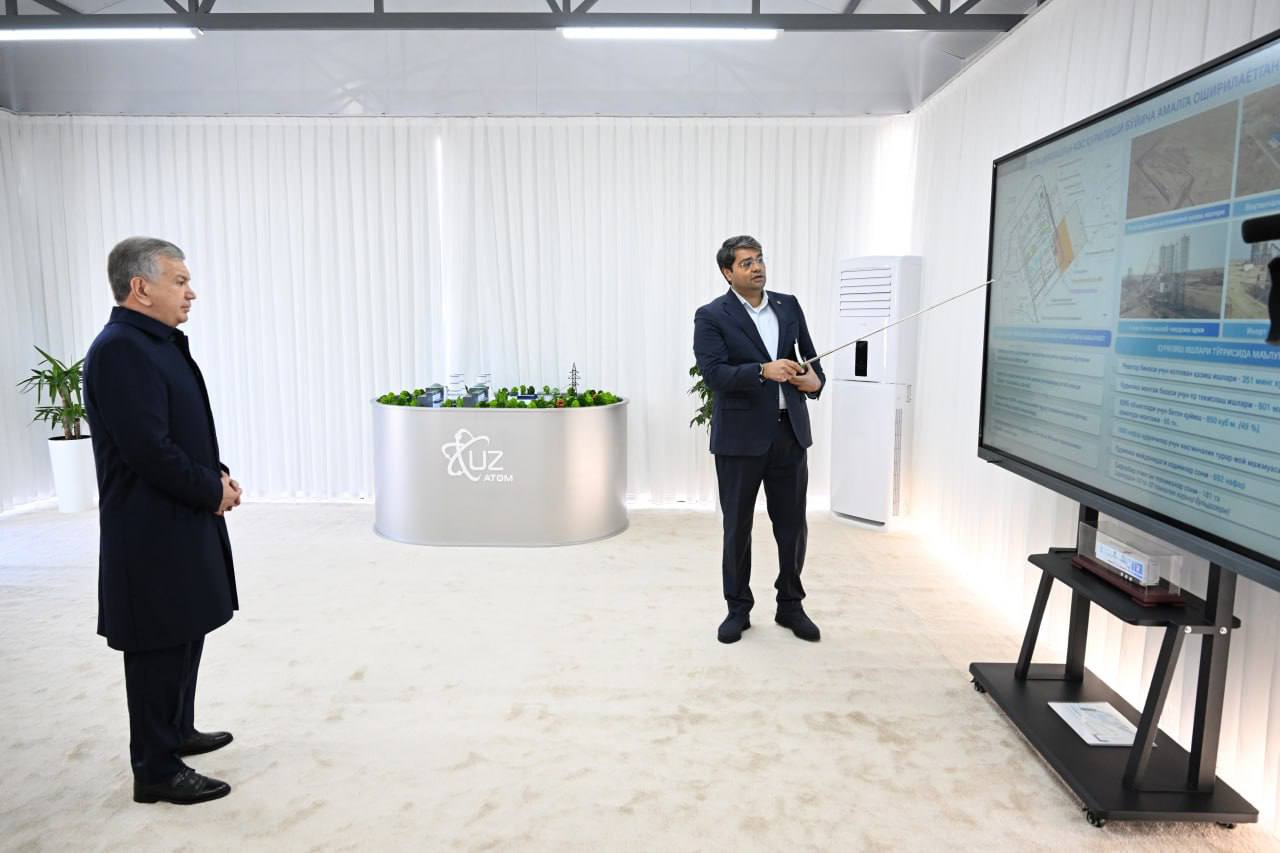 Также президенту была представлена информация о ходе реализации проектов атомной энергии. В настоящее время в Джизакской области ведётся строительство интегрированной атомной электростанции, включающей два маломощных и два крупных реактора. На текущем этапе продолжаются работы по рытью котлованов под здания реакторов и подготовке строительной базы. Для строителей возведен временный жилой комплекс.