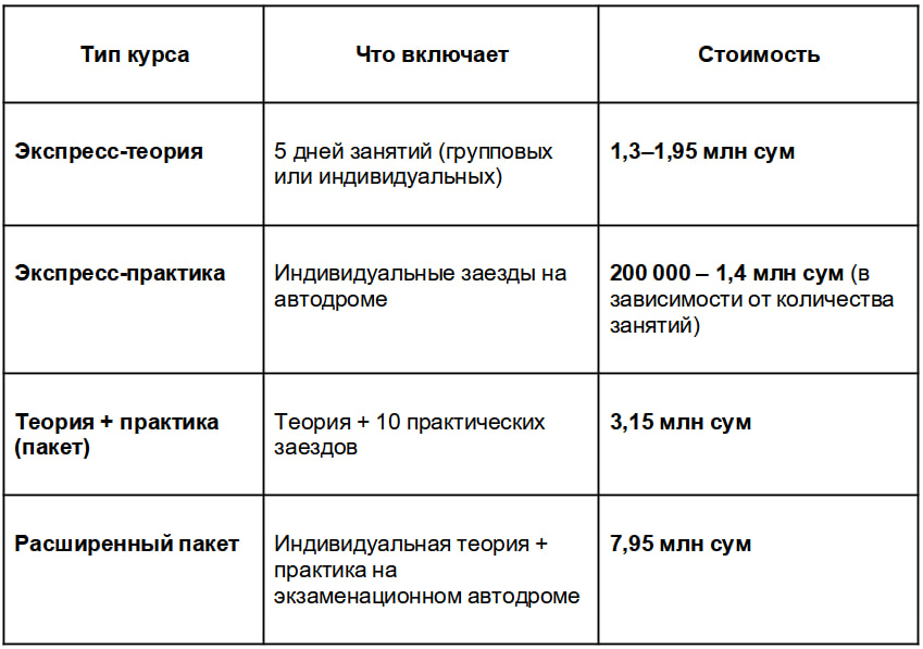 Стоимость обучения в женских автошколах такая же, как и в обычных: в среднем 6–7 млн сумов за полный курс. Программа полностью совпадает с требованиями СБДД, различается только формат: группы формируются из женщин, а занятия ведут женщины-инструкторы.
