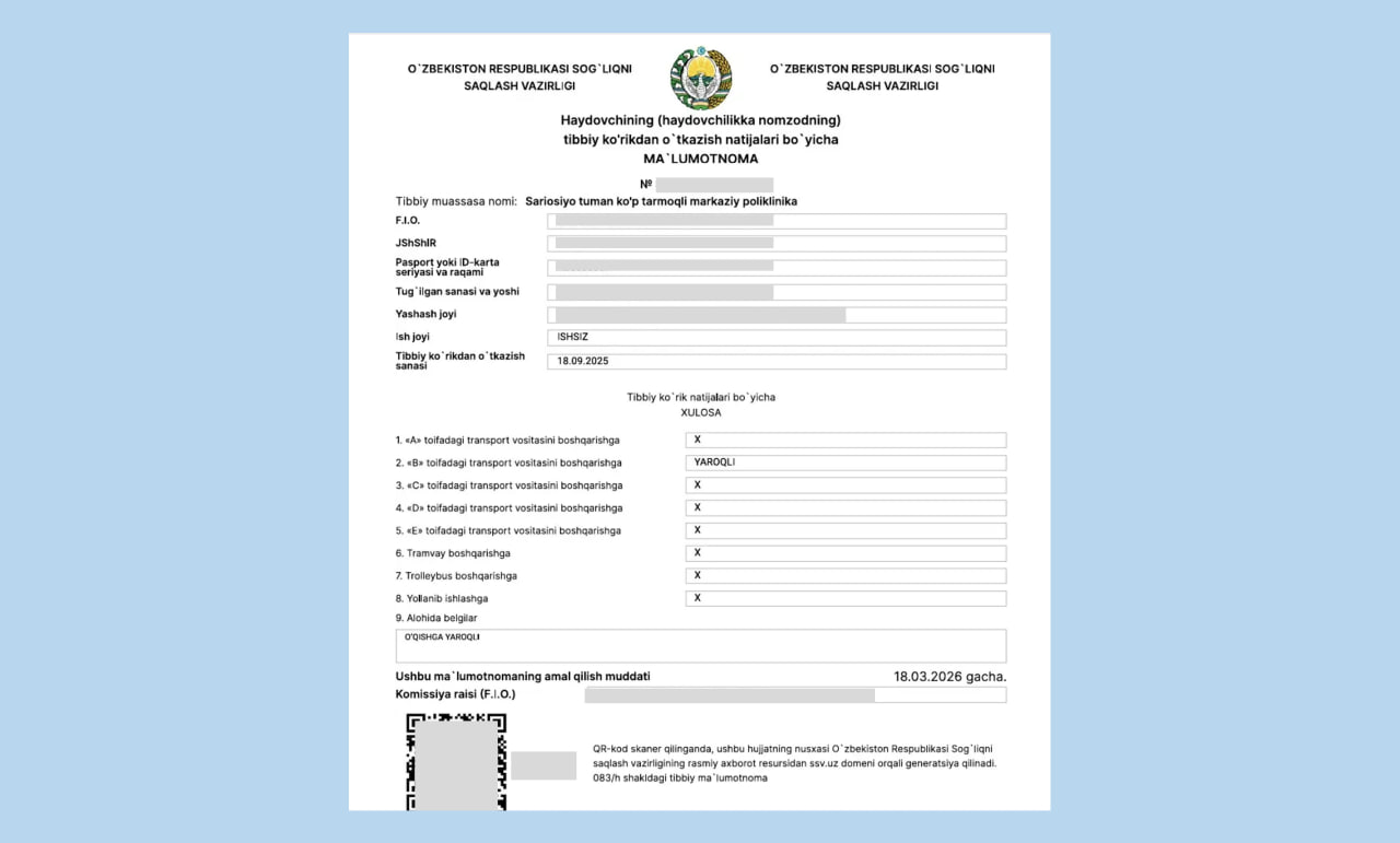 Если оформление происходит через портал my.gov.uz, паспортные данные вводятся автоматически, а справка появляется в системе после медосмотра. После оплаты сбора за изготовление удостоверения права будут готовы за один–три дня. Размер сбора составляет 0.7 БРВ: при действующем значении 412 000 сумов это 288 400 сумов.