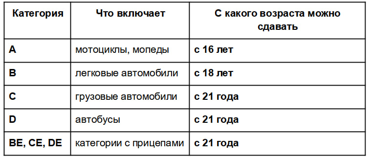 Получить водительские права категории B можно с 18 лет. Возрастные требования отличаются для разных видов транспорта, поэтому ниже приведены минимальные значения для самых распространённых категорий.