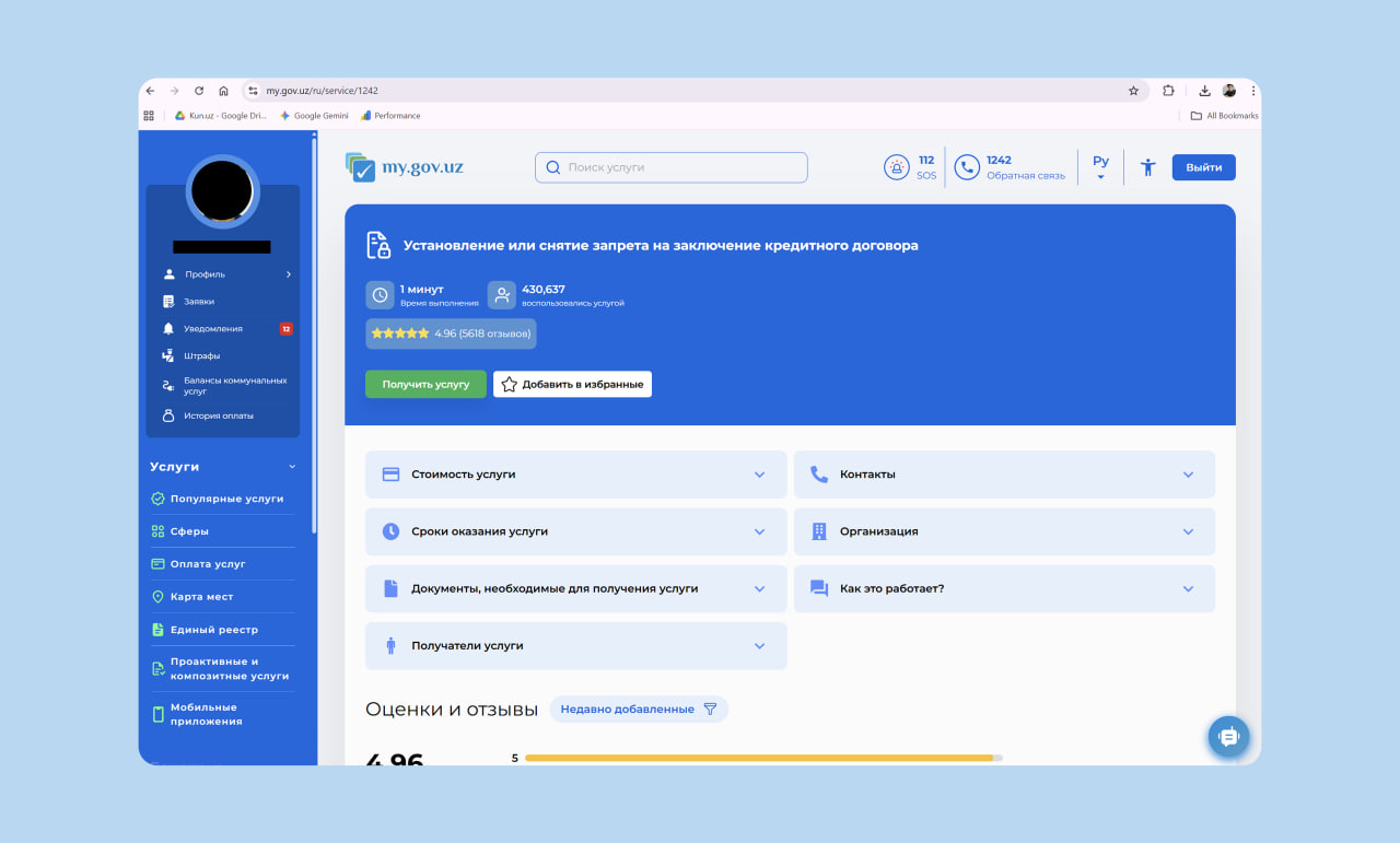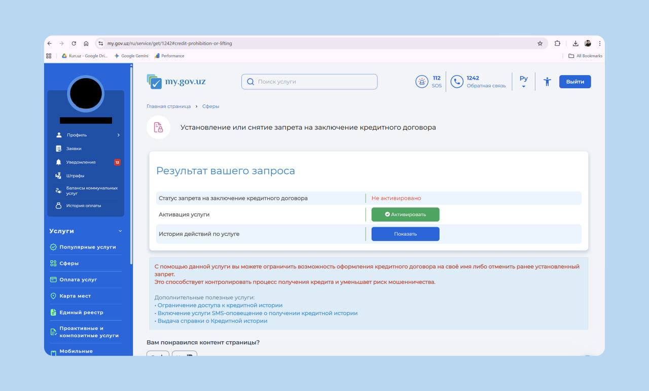 Откройте карточку услуги и нажмите «Получить услугу» (Xizmatni olish). Выберите действие «Активировать» (Faollashtirish). Система обработает заявку и подключит самозапрет автоматически. В течение 10 минут на вашу электронную почту придёт подтверждение с электронным документом.