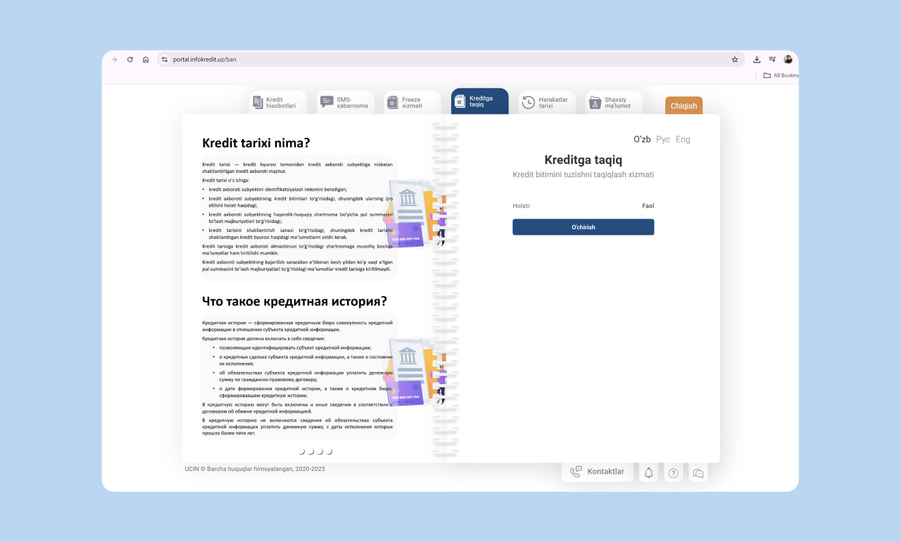 С июня 2025 года каждый житель Узбекистана может за пять минут бесплатно запретить банкам и микрофинансовым организациям выдавать кредиты на своё имя. Этой услугой уже воспользовались почти 150 тысяч человек.