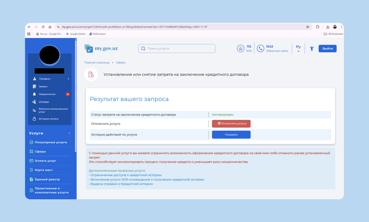 Зайдите на my.gov.uz или откройте приложение MyGov (доступно в Google Play и App Store). Авторизуйтесь через OneID. В поисковой строке введите: «Установление или снятие запрета на заключение кредитной сделки».