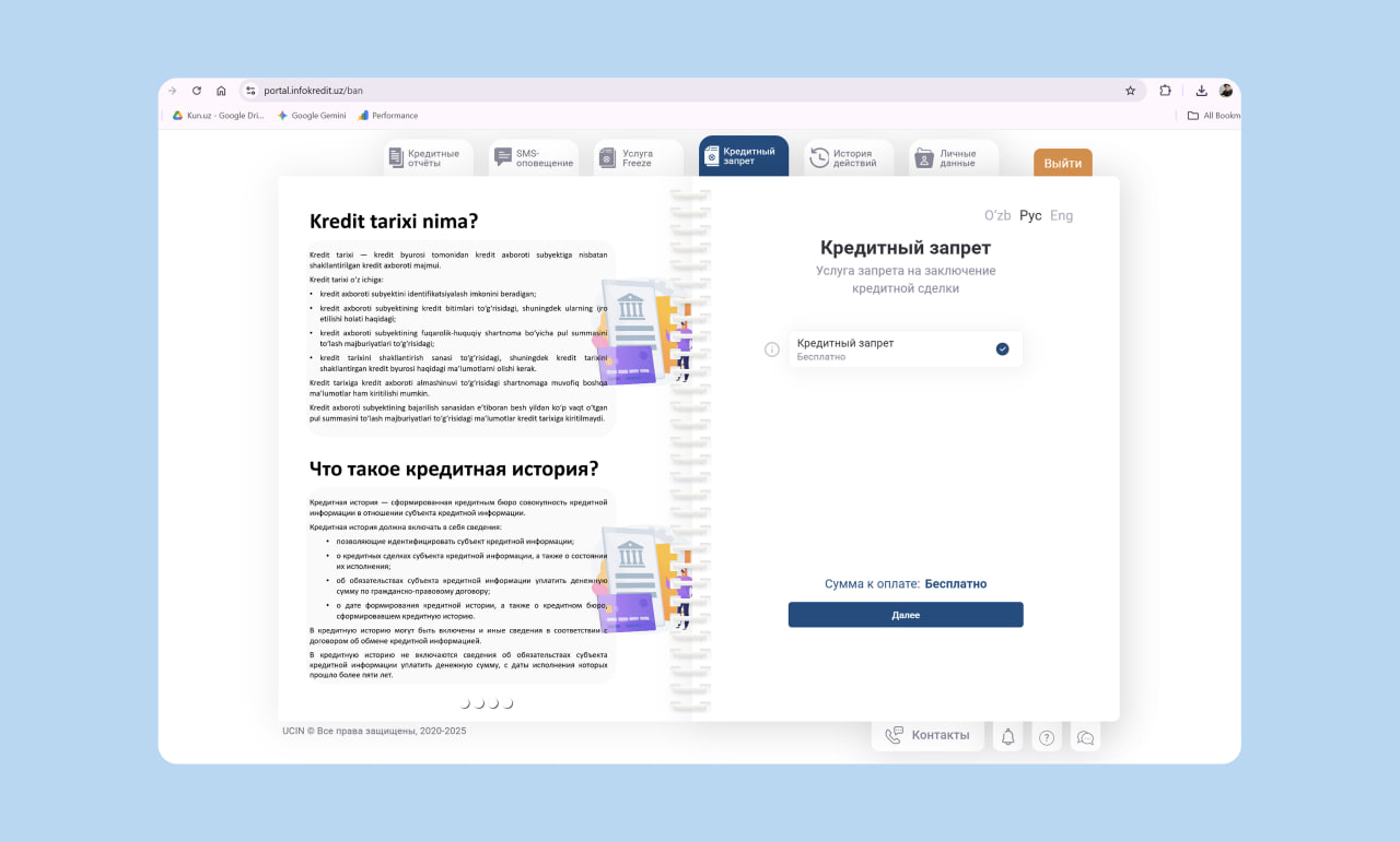 После входа в личный кабинет найдите вкладку «Кредитный запрет» (Kredit taqiq). Нажмите кнопку «Следующий» (Keyingi).