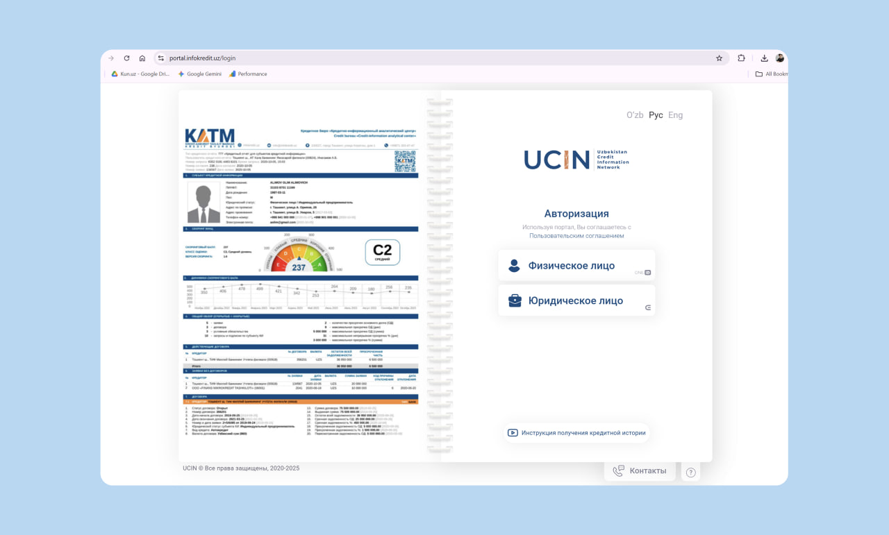 Откройте сайт portal.infokredit.uz и нажмите кнопку «Войти как физическое лицо». Система перенаправит вас на страницу аутентификации OneID - единой системы идентификации Узбекистана. Если у вас нет аккаунта OneID, зарегистрируйтесь через id.egov.uz - это займёт пару минут, понадобится серия и номер паспорта.