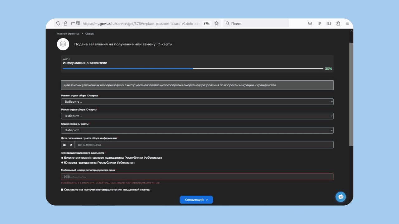 - Заполнить заявление — на месте или онлайн через my.gov.uz