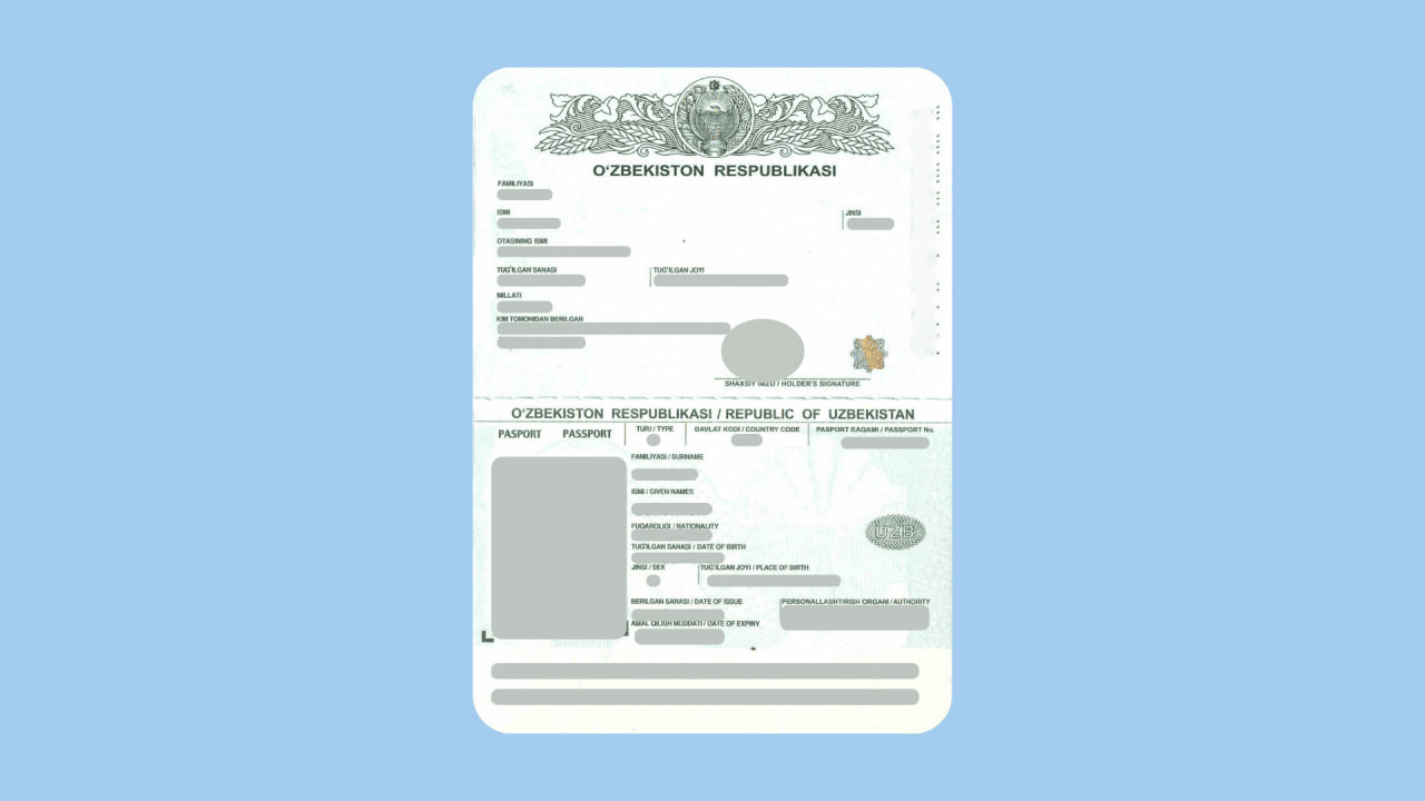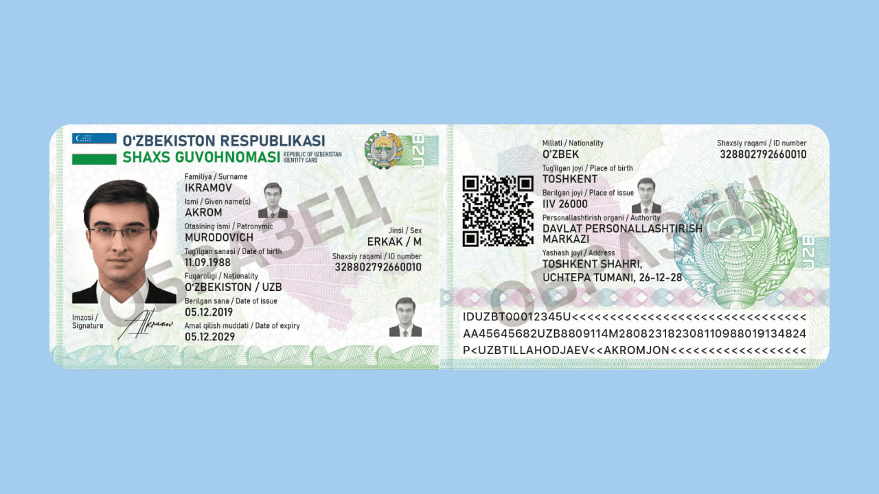 ID-карта — документ в виде карты, удостоверяющий личность и гражданство владельца внутри Узбекистана. В ней есть чип с вашими личными данными и биометрией (отпечатки пальцев, фото). На сторонах ID-карты нет подробной информации, как в паспорте. Например, нет данных о прописке или временной регистрации. Часть данных содержится на чипе.