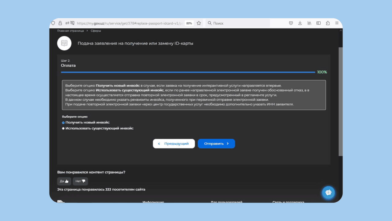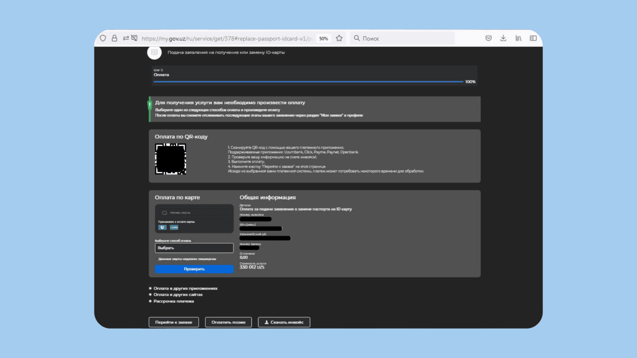Оплачивать онлайн дешевле. Сумма при подаче через my.gov составляет 330 012 сум. Сумма при оплате через ЦГУ или паспортный стол 366 680 сум.