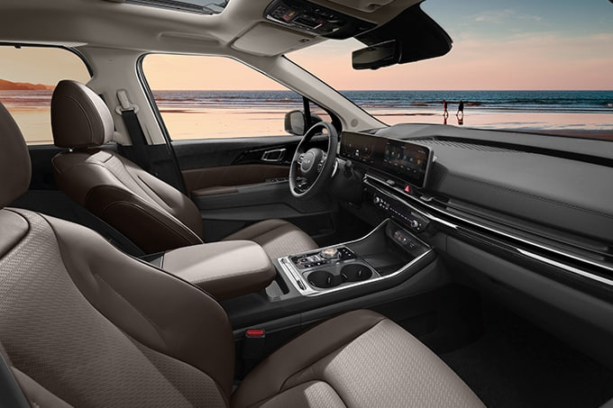 Салон Kia Carnival традиционно остаётся одним из ключевых преимуществ модели. Интерьер построен вокруг идеи простора, чёткого зонирования и визуального уюта, а футуристичный характер формируется за счёт лаконичных линий и продуманного освещения.