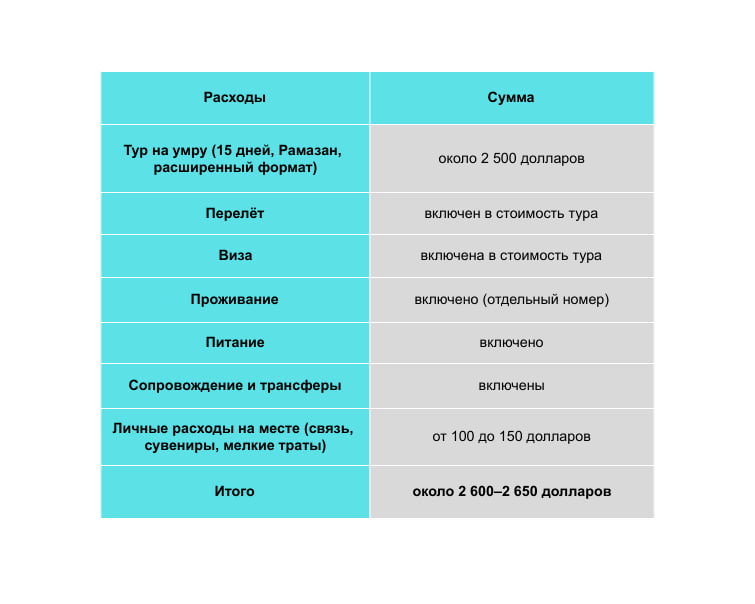 - 14–15 дней — более длительные поездки, которые обходятся дороже за счёт проживания и питания. В эконом-формате даже в Рамазан такие туры стоили от 1 200 до 1 500 долларов на человека, а при более комфортных вариантах с отдельным номером — до 2 500 долларов и выше.