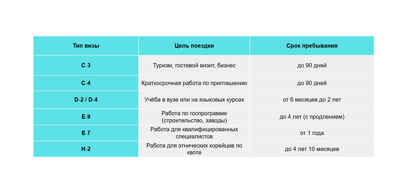 Выдается специалистам, приглашенным в Республику Корея для выполнения краткосрочных работ. Требуется контракт и документы от работодателя. Срок — до 90 дней.