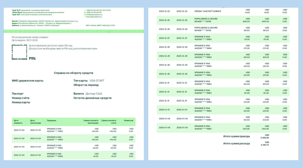 Для учебных виз (D-2 и D-4) финансовая состоятельность подтверждается справкой из KDB Bank Uzbekistan, оформленной на имя заявителя и соответствующей требованиям консульства по сумме и сроку хранения средств.