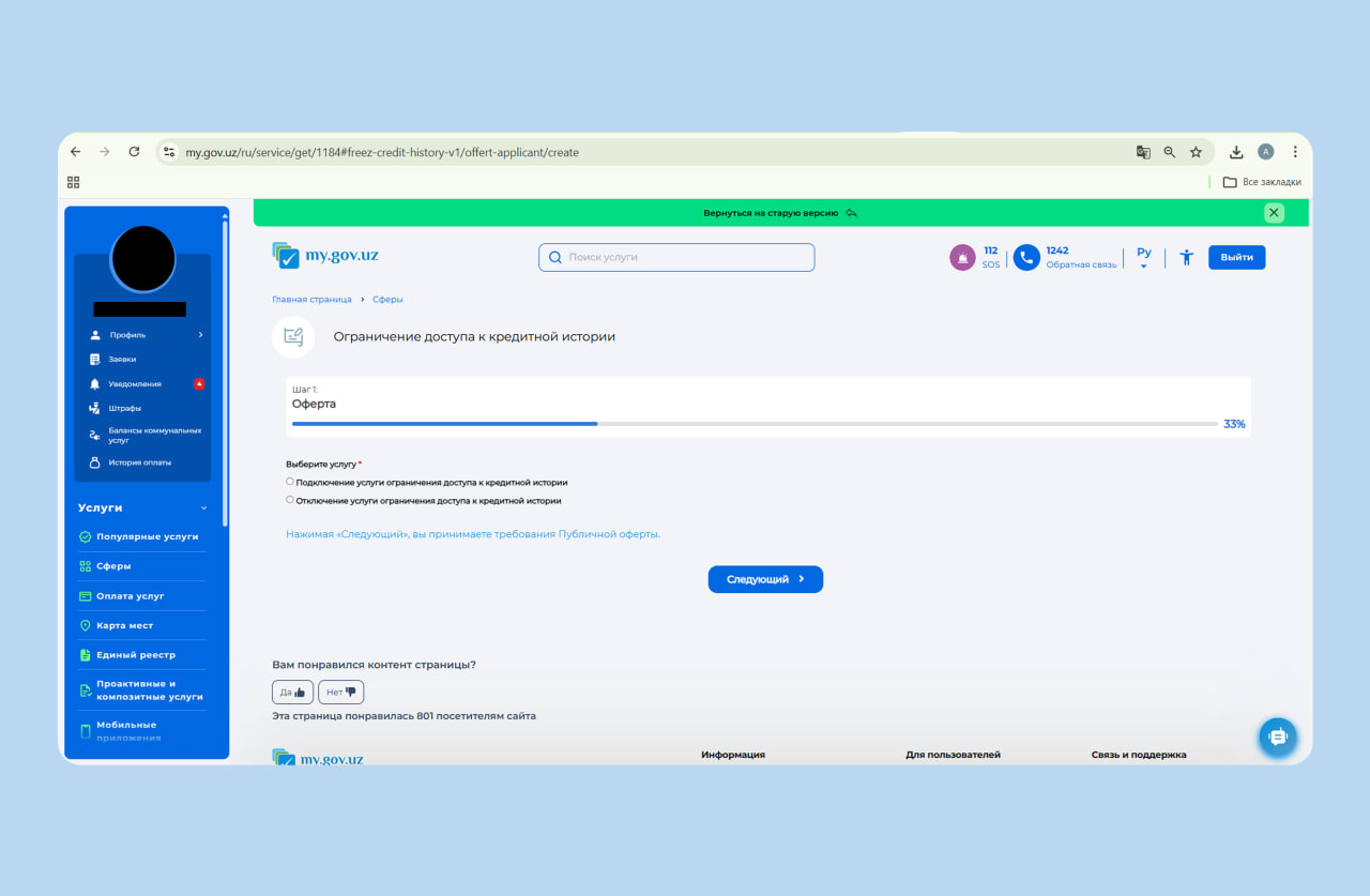 В поиске найдите услугу “Ограничение доступа к кредитной истории”. Выберите действие по снятию ограничения, заполните электронную форму и отправьте заявку. После обработки информация о снятии Freeze фиксируется в системе автоматически.