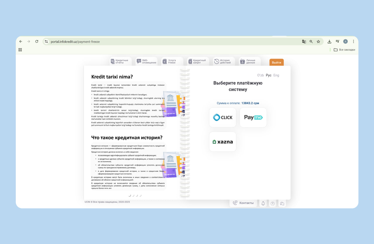 В Узбекистане действует услуга Freeze - добровольное ограничение на получение кредитной истории. Я подключила эту услугу самостоятельно, через онлайн-сервисы. После ее активации банки и другие кредитные организации не могут получить кредитную историю из кредитного бюро, из-за чего оформление нового кредита становится невозможным. Freeze используют как меру защиты от кредитного мошенничества.