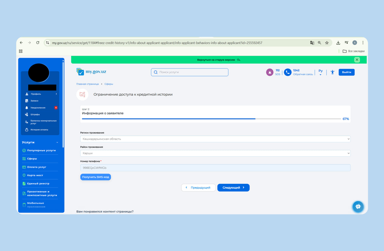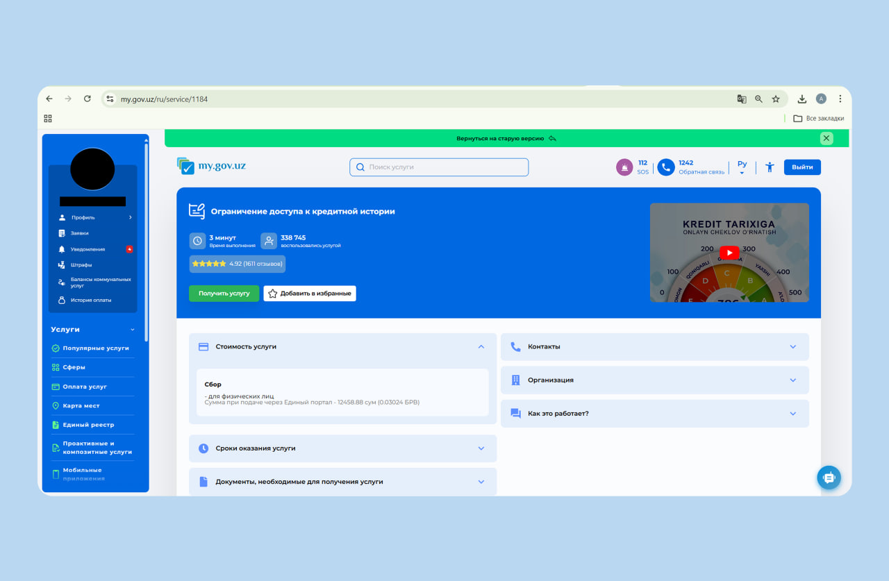 1. Зайдите на my.gov.uz или откройте приложение MyGov и авторизуйтесь через OneID. В поисковой строке найдите услугу, связанную с установлением ограничений на кредитные операции.